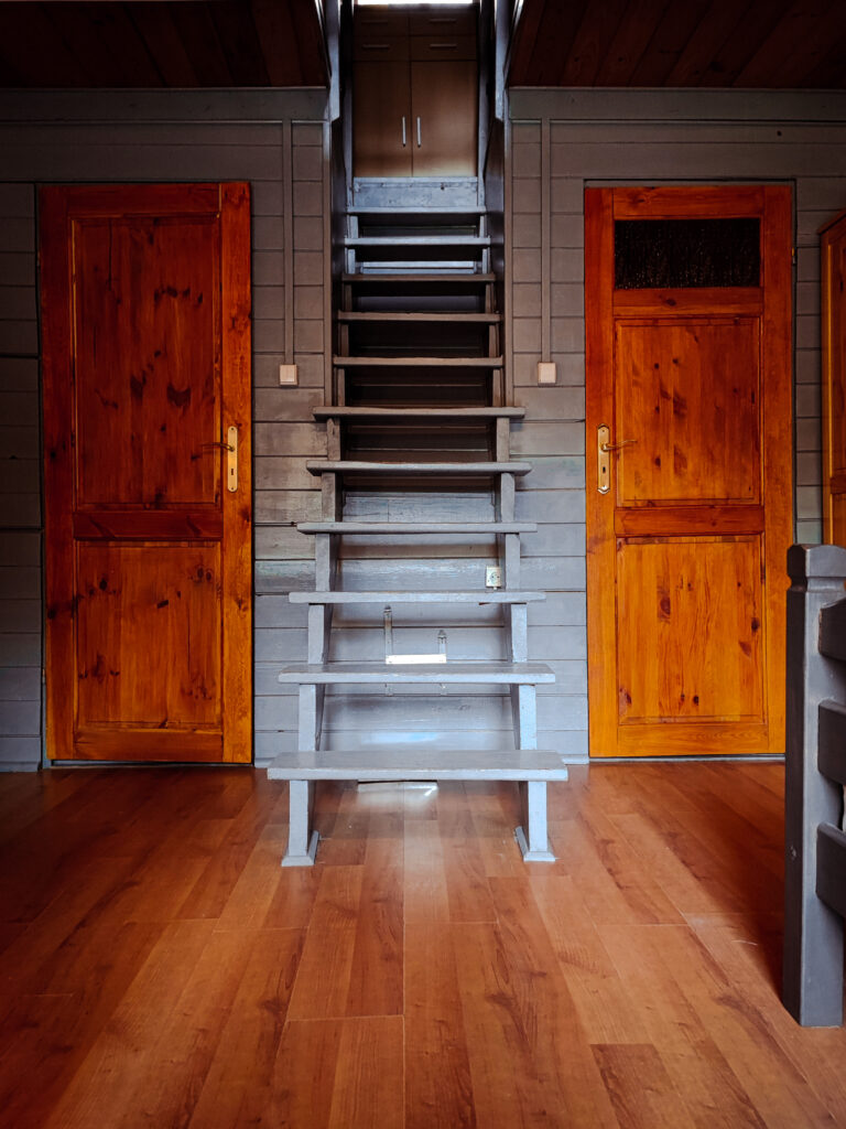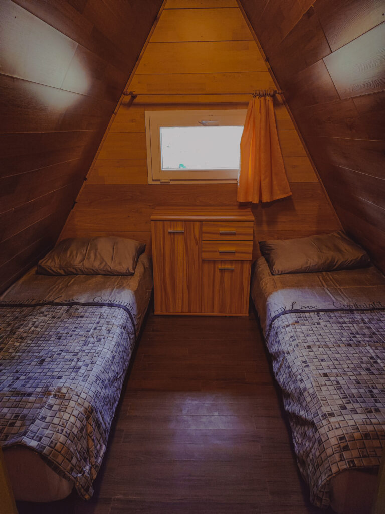 Na piętrze znajduje się część sypialniana, z której można wyjść na balkon z widokiem na lasy i górskie krajobrazy. Wygodne łóżka gwarantują spokojny sen, a naturalne otoczenie sprzyja pełnemu odprężeniu.