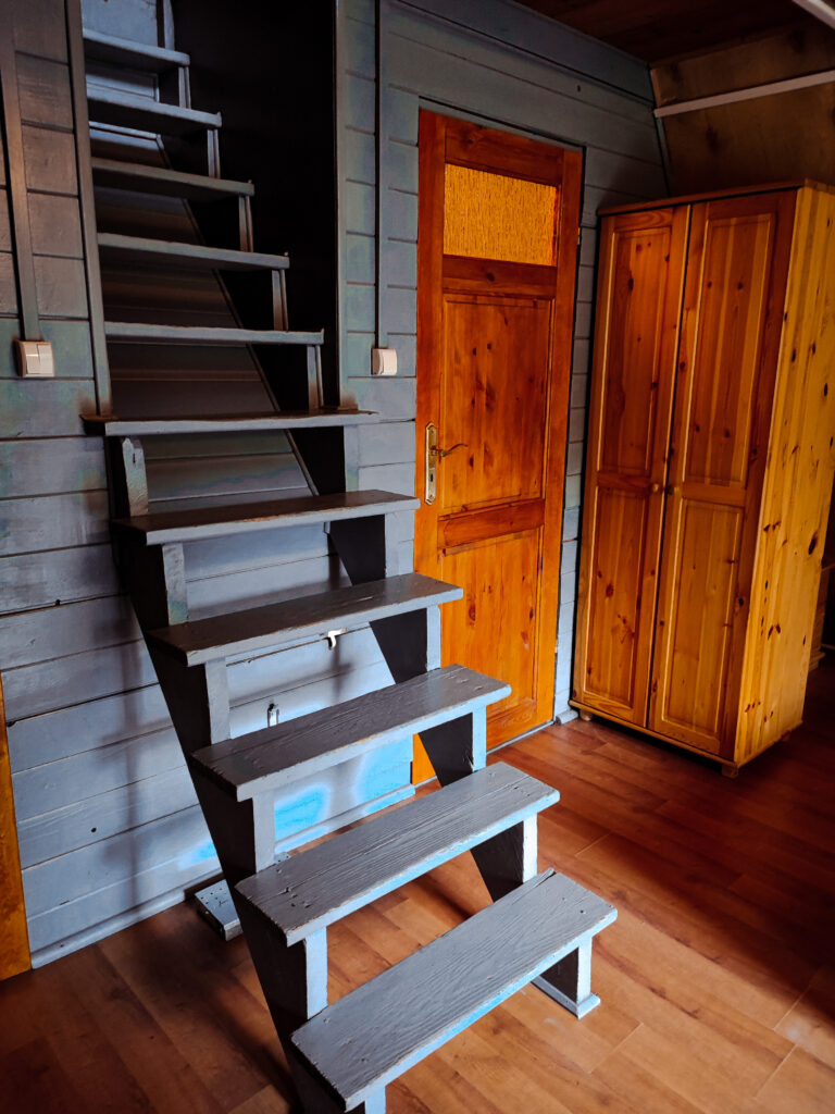 Na parterze znajduje się przestronny salon z jadalnią, w którym możesz odpocząć na wygodnej, rozkładanej kanapie, a duży stół pozwoli na wspólne posiłki. Aneks kuchenny jest w pełni wyposażony – znajdziesz w nim komplet naczyń, czajnik, płytę grzewczą oraz lodówkę, dzięki czemu możesz przygotowywać ulubione posiłki. Na tym poziomie znajduje się również łazienka z prysznicem, zapewniająca wygodę i prywatność.